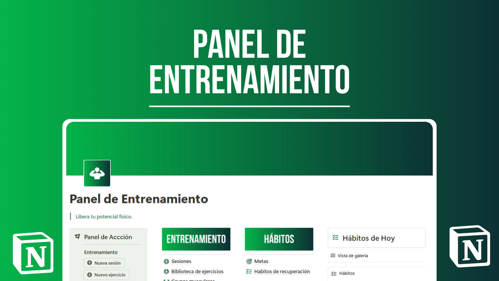 Nuestra Plantilla de Panel de Entrenamiento en Notion está diseñada para ayudarte a planificar, registrar y analizar tus entrenamientos de manera eficiente. Organiza tus sesiones, sigue tu progreso y mantén el equilibrio con hábitos de recuperación para maximizar resultados.